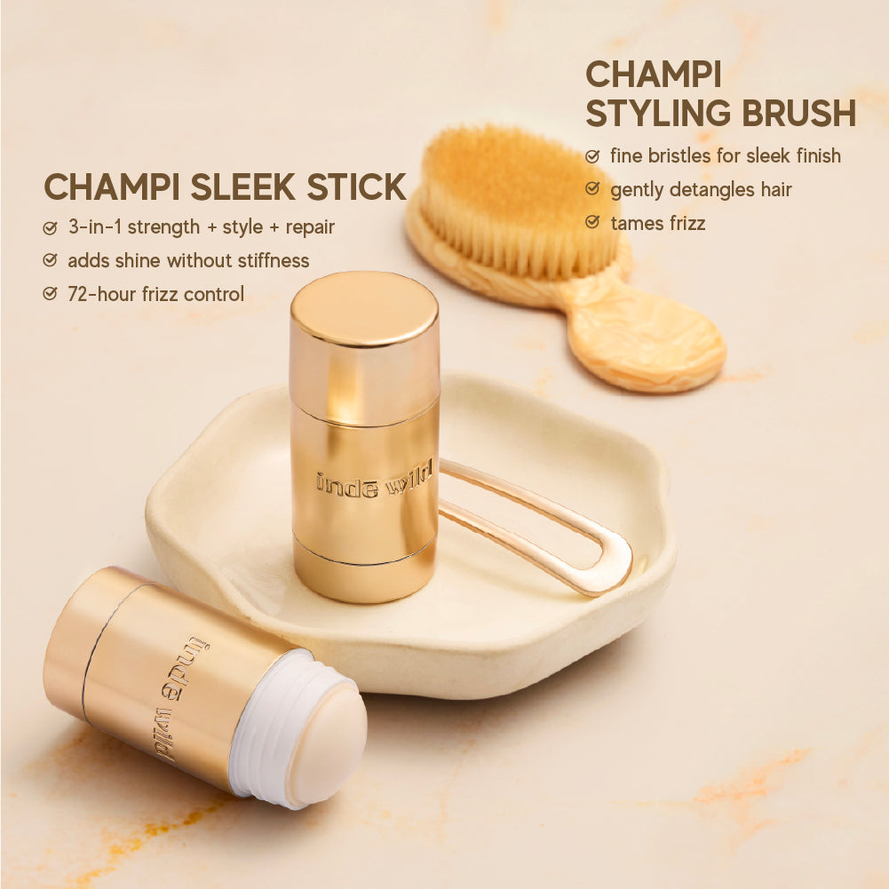 Meet the Champi Sleek Stick & Brush Duo, your all-in-one, on-the-go ritual for sleek, strong, and glossy hair.